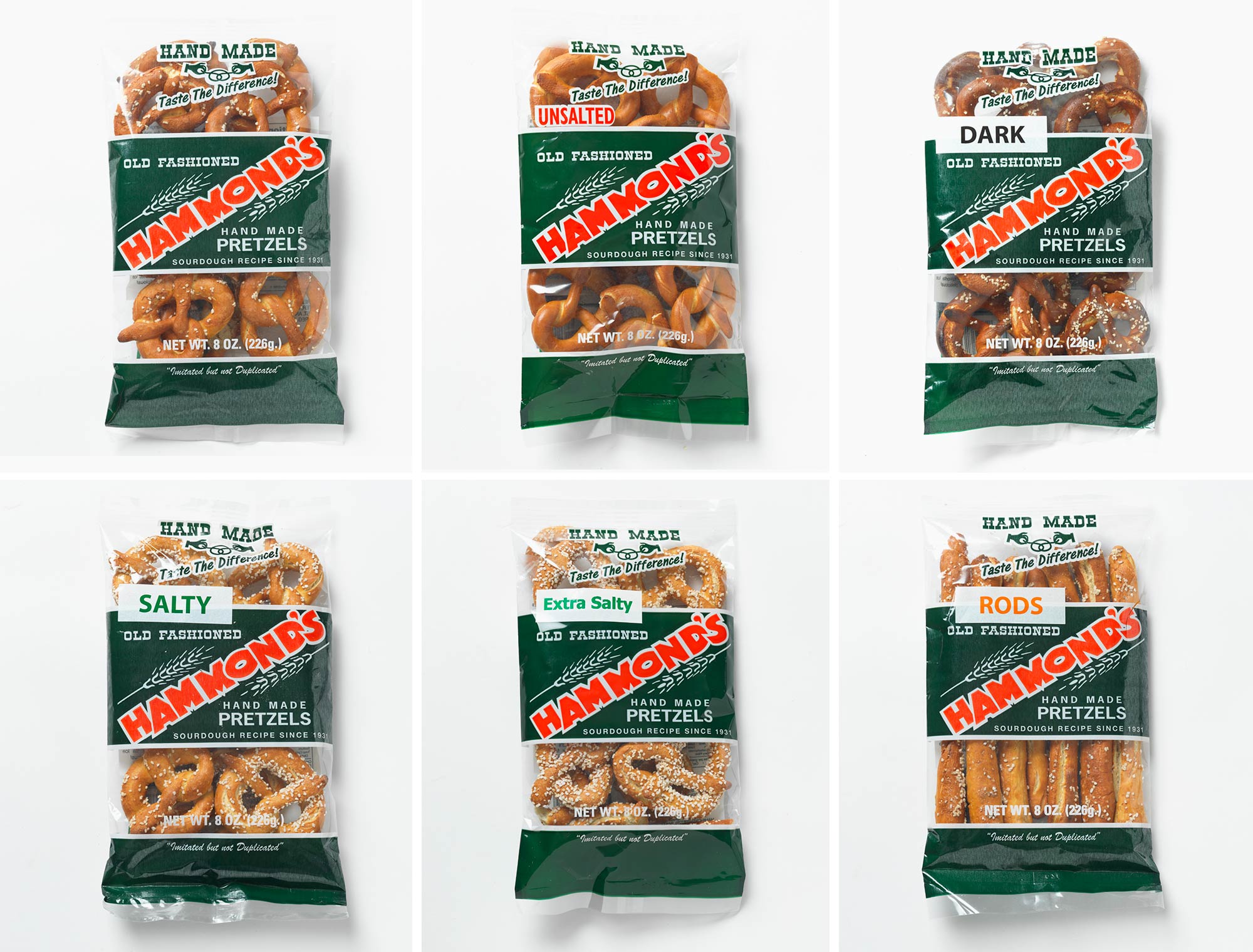 Choose from regular, salty, extra salty, unsalted, dark salted pretzels and pretzel rods. We make and salt our sourdough pretzels by hand! Salt amount will vary.